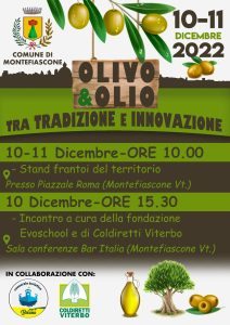 Al via domani a Montefiascone la due giorni “Olio & Olio” tra tradizione e innovazione con convegni stand e degustazioni. L’evento, organizzato da Coldiretti Viterbo e Fondazione EvoSchool in collaborazione con il Consorzio Turistico “Lago di Bolsena” e il Comune di Montefiascone, si aprirà domani alle dieci con gli stand dei frantoi del territorio in Piazza Roma, per proseguire alle 15.30 nella Sala conferenze Bar Italia con un incontro a cura della Fondazione EvoSchool e Coldiretti Viterbo, con un convegno e degustazione degli olii dei produttori locali. La manifestazione proseguirà sempre in Piazza Roma anche nella giornata di domenica.